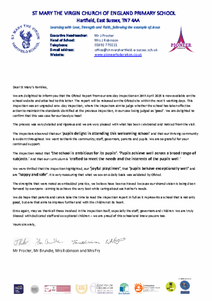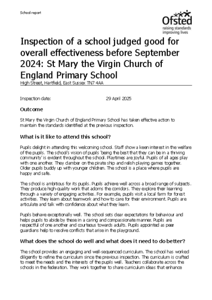 Welcome to St. Mary the Virgin Hartfield – the small school with the big heart! Set in the beautiful Sussex countryside our Church of England (Voluntary Aided) School serves families from Hartfield & the surrounding towns and villages. We are fortunate to have a team of the most wonderful children & staff and pride ourselves on putting the children at the heart of everything we do. St. Mary’s is a warm & nurturing school providing an engaging curriculum that can foster a passion for learning, curiosity & self-confidence. We believe everybody is unique & has strengths & talents, that through our school vision of Learning with Love, Strength & Faith, following the example of Jesus, we can help them to be the very best they can be. We look forward to meeting you soon.